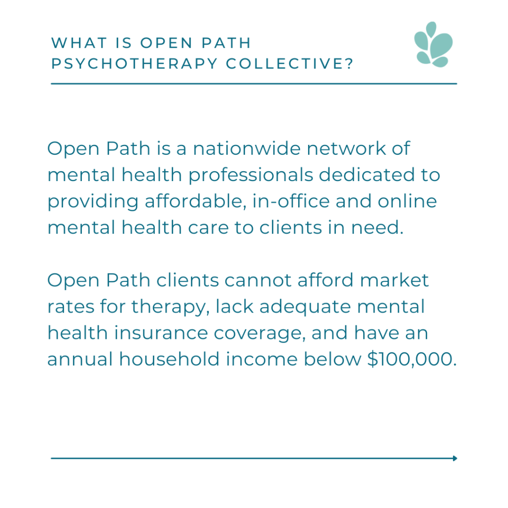 Open path is another option to receive therapy services at Samantha Joy Counseling, but not at the private pay rates listed in the FAQs & Rates section. If you are eligible on Open Path you can have the opportunity to access low-cost therapy. Click on my Open Path Page for more information!